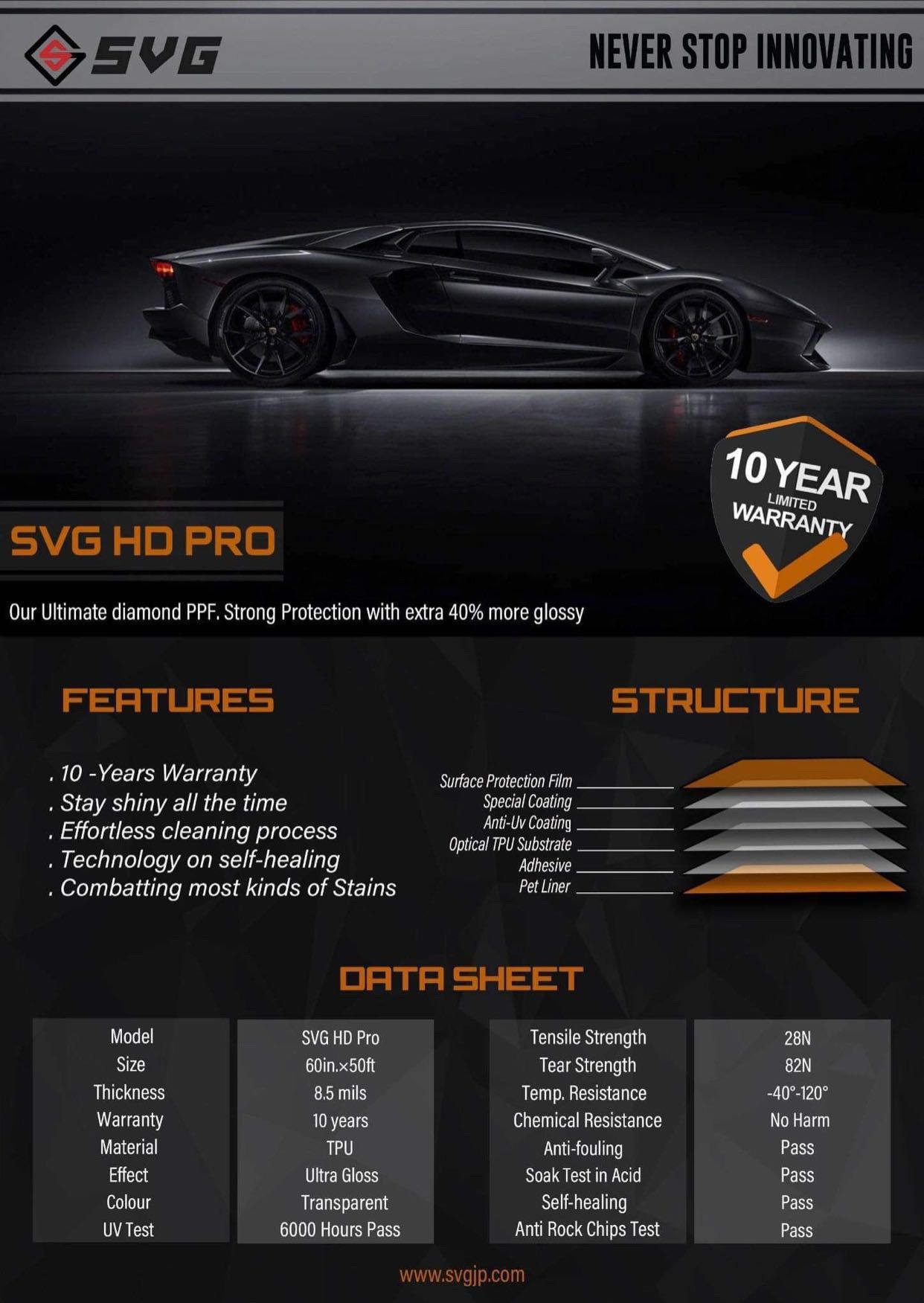 SVG PPF SeriesSVG HD PROSVG HD pro is for vehicle owners who want their finish to stand tough through the extreme driving conditions that come with track racing, gravel roads, off-roading, and harsh weather. It’s virtually invisible, thicker than traditional paint protection film, and able to deliver chip-fighting, high-impact resistance.